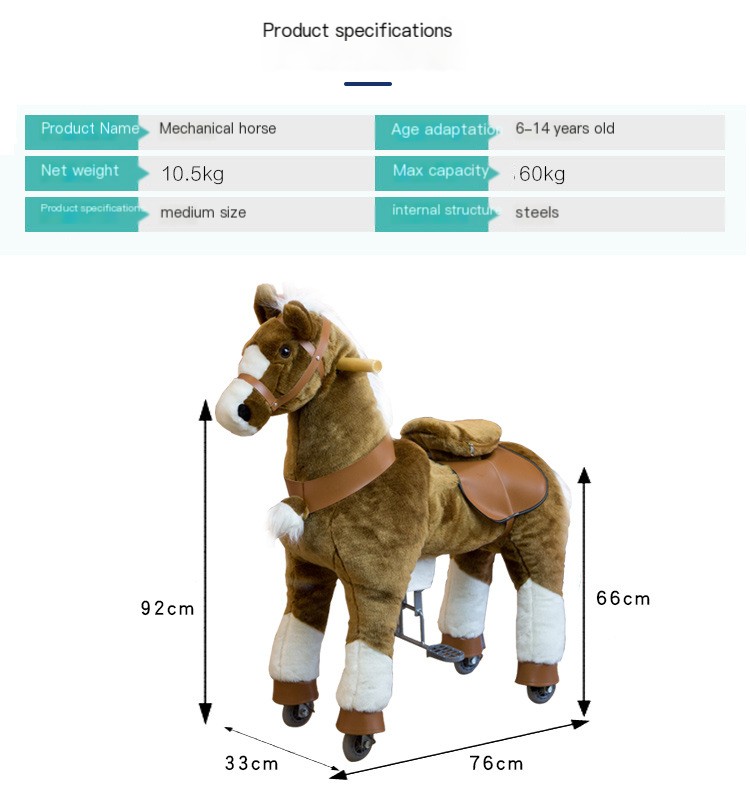 The material of the Knight Kingdom mechanical horse is plush and steel. The plush is soft and comfortable, and the steel is strong and durable. Its appearance design is simulated and cute, and it is available in a variety of colors and styles. It can also make real horse sounds, increasing children's interest and interactivity.